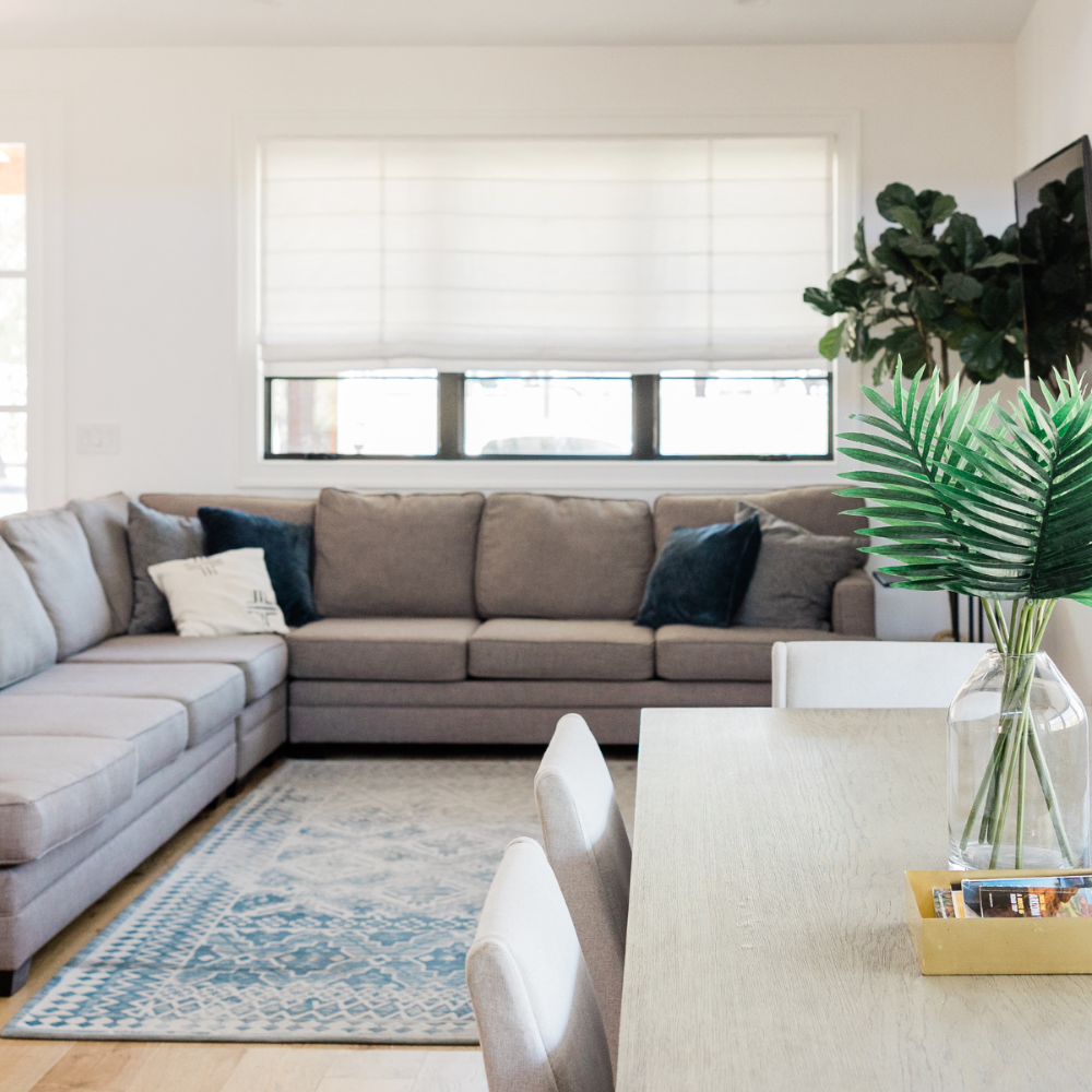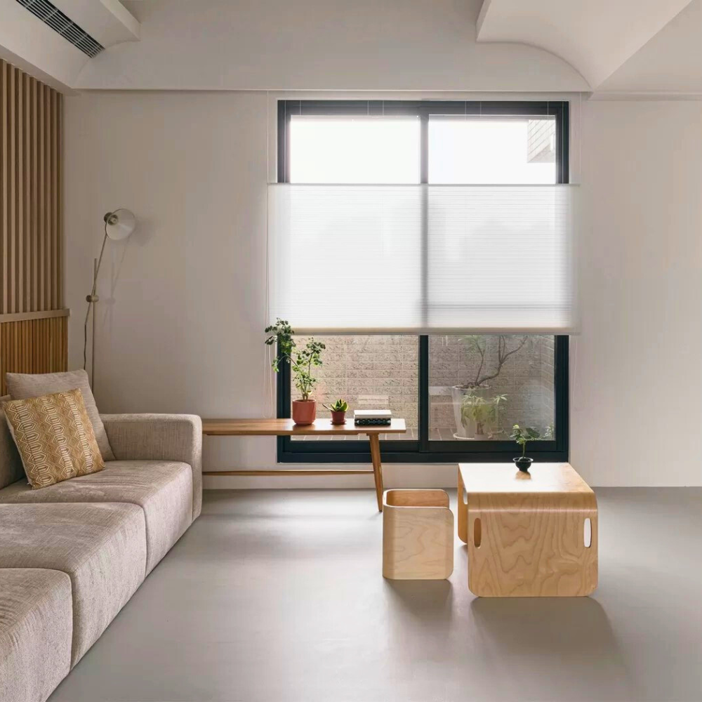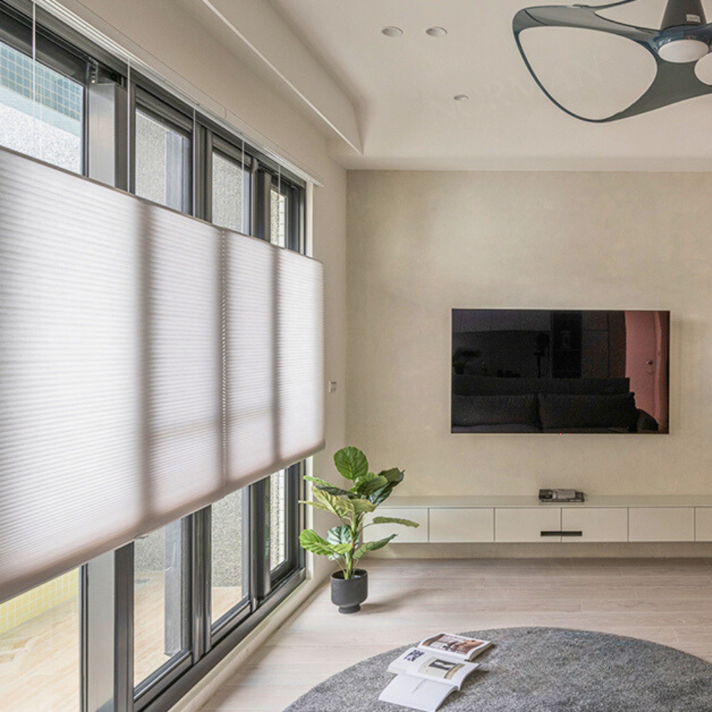 - In the living room, white cellular shades hang gracefully. They match the gray carpet and beige walls. Nearby green plants add vitality.
