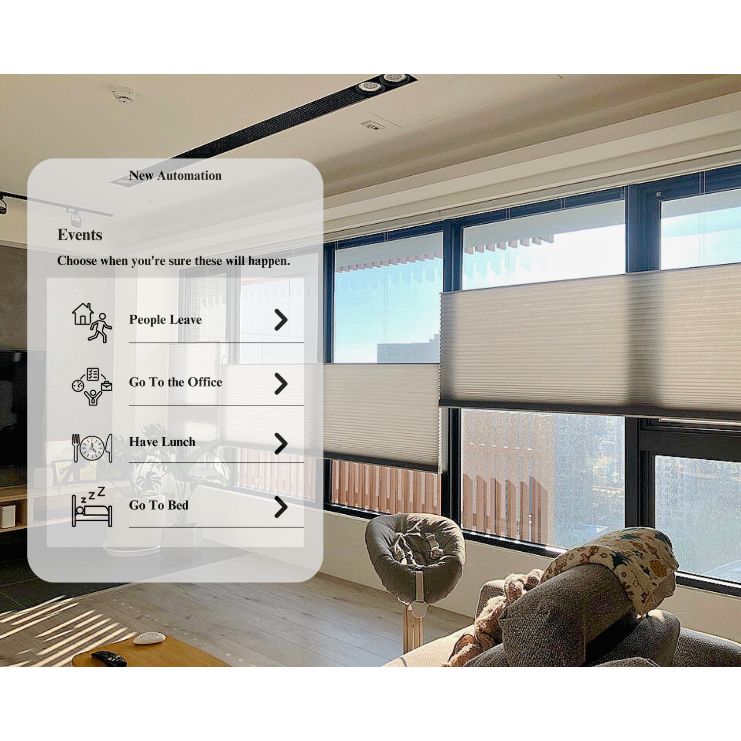 - Whether it’s letting in the morning sunlight, minimizing afternoon glare, or ensuring complete privacy in the evening, you can set automated schedules or responses for different times of day and specific scenarios.