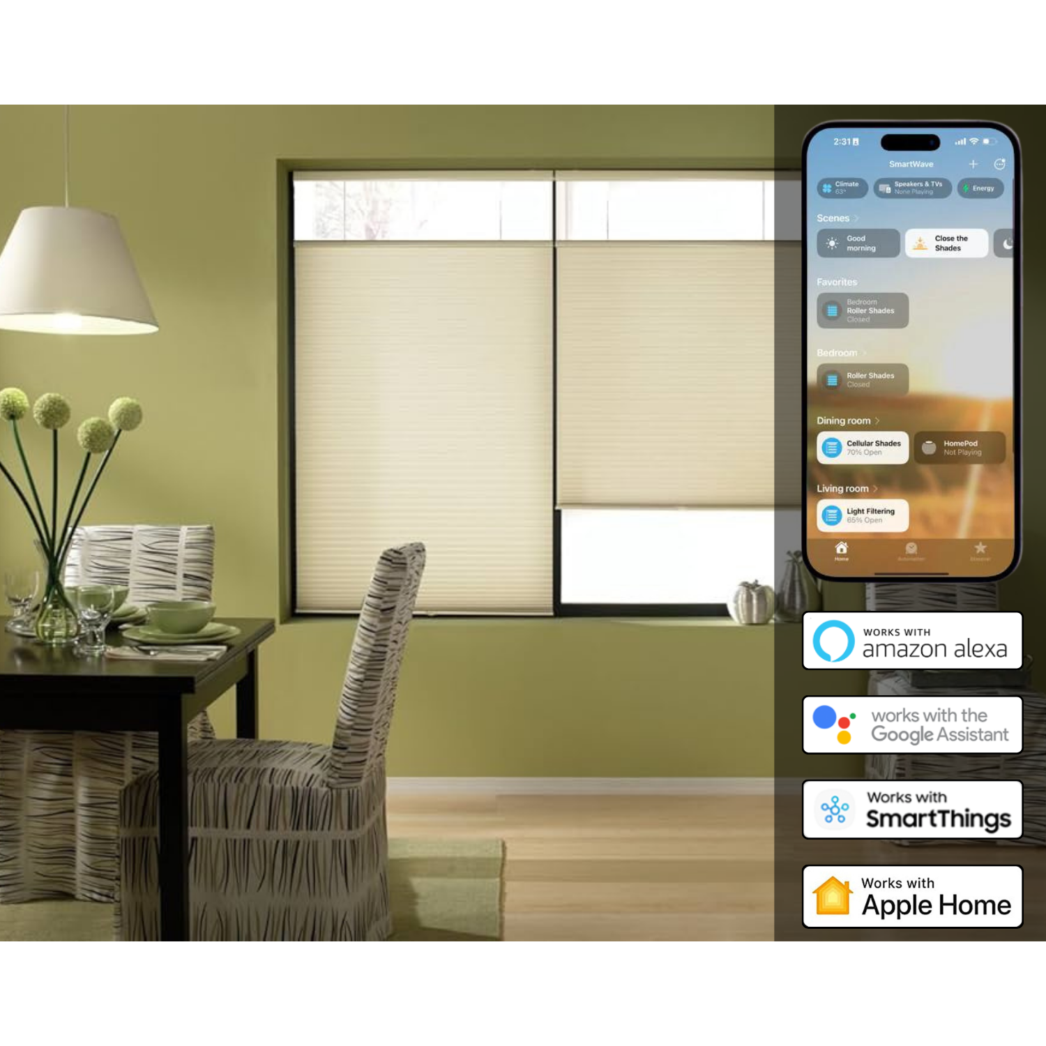 - Our electric cellular shade motors integrate effortlessly with Amazon Alexa, Apple HomeKit, Samsung SmartThings, and Google Assistant.