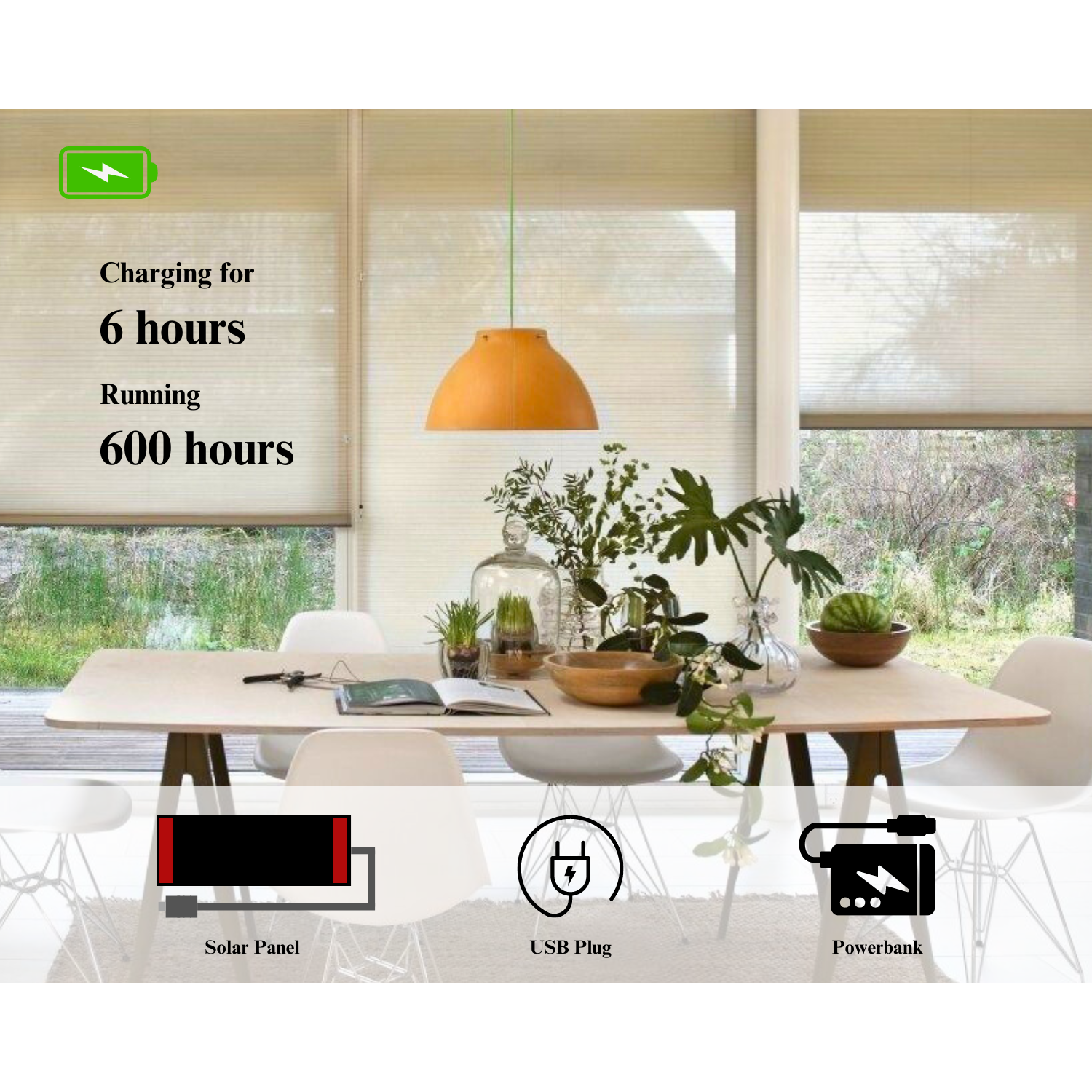 - With just 6 hours of charging, your shades can operate for up to 600 hours, ensuring they’re always ready when you need them. Whether you prefer sustainable energy or the flexibility of on-the-go charging, our motors keep your shades powered with ease.