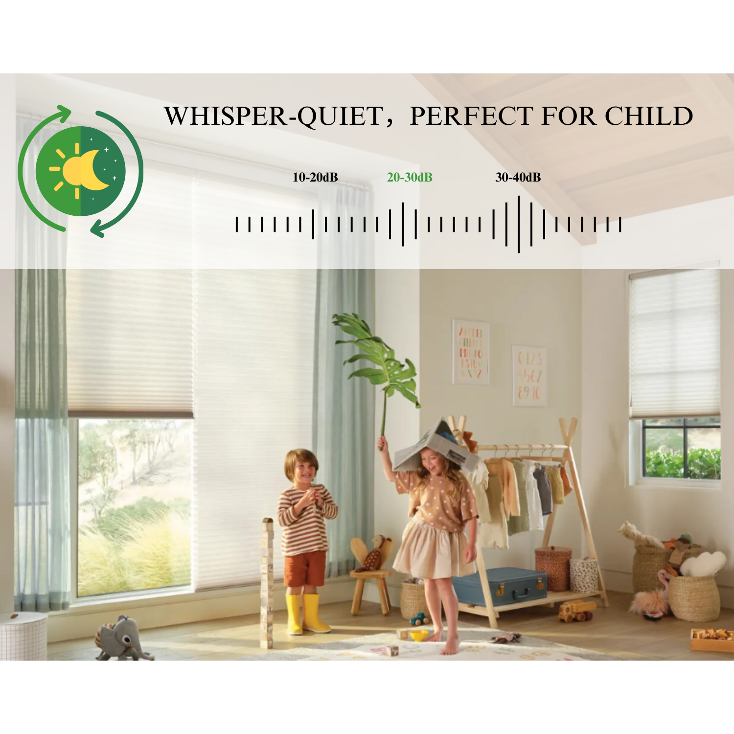 - Our electric cellular shades are engineered to operate with minimal noise, customizable to your preference within a range of 20-30dB.
