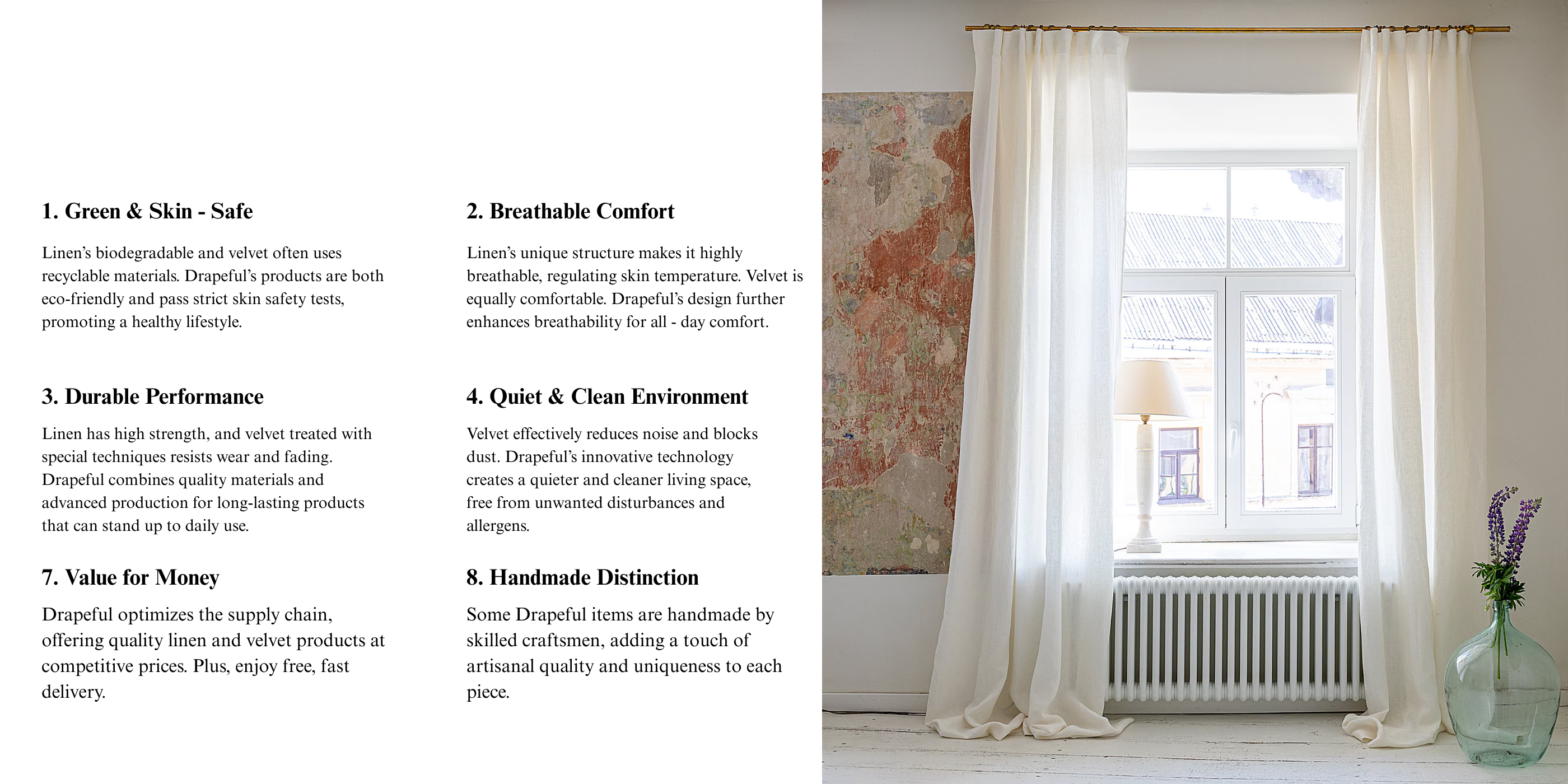 Upon delivery of the goods, you will promptly examine them. If any of the goods ordered have been damaged in transit or have been incorrectly shipped, does not meet your requirements or are defective through faulty material or factory workmanship. Please kindly notify us by writing to us through email at contact@drapeful.com within 30 days from the date of delivery of the relevant goods.
