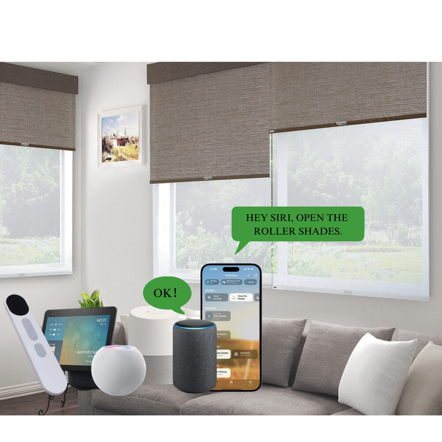 - Whether you prefer the ease of a remote control, the flexibility of managing your shades through a mobile app, or the hands-free convenience of voice control with your smart speaker, our system has you covered.