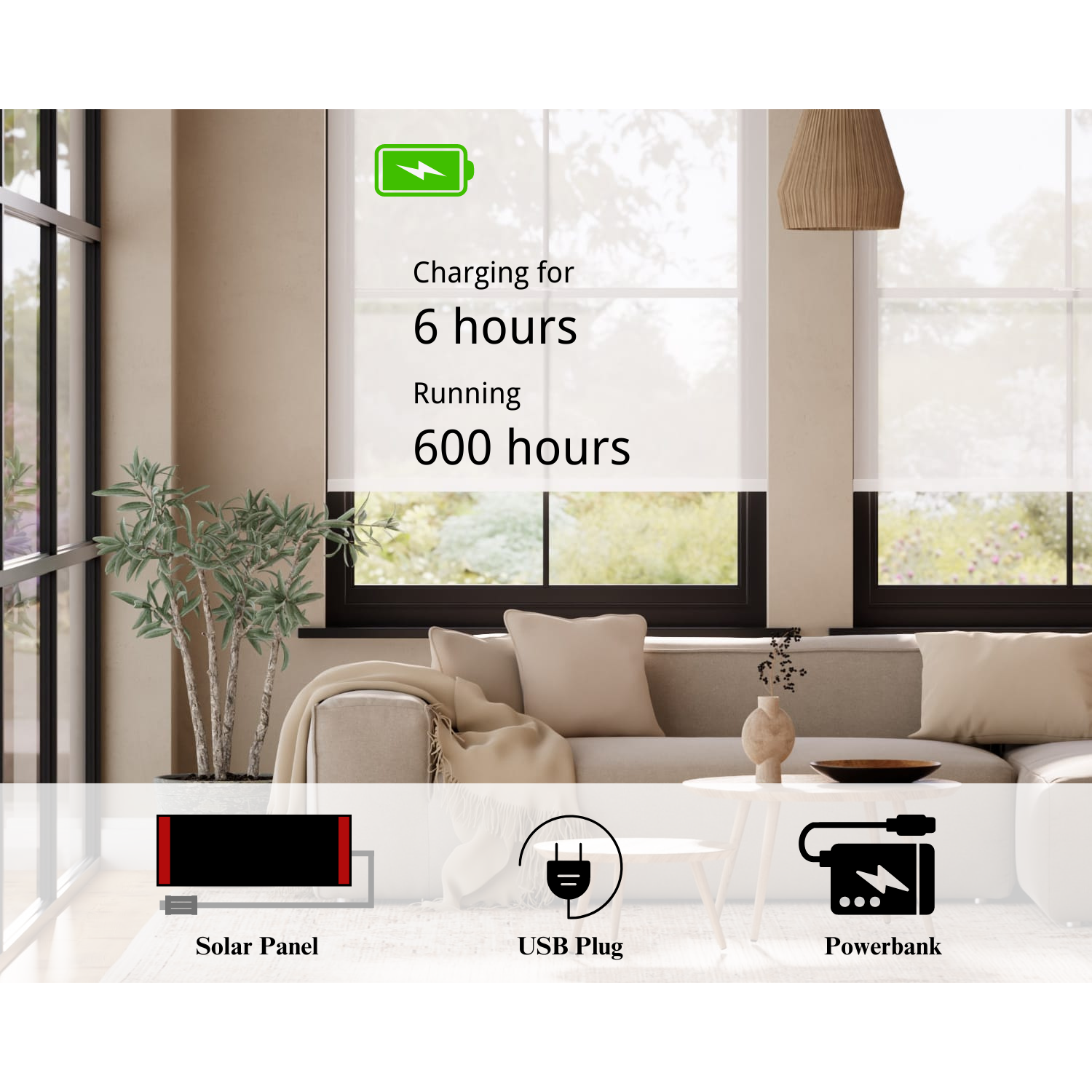 - With just 6 hours of charging, your shades can operate for up to 600 hours, ensuring they’re always ready when you need them. Whether you prefer sustainable energy or the flexibility of on-the-go charging, our motors keep your shades powered with ease.