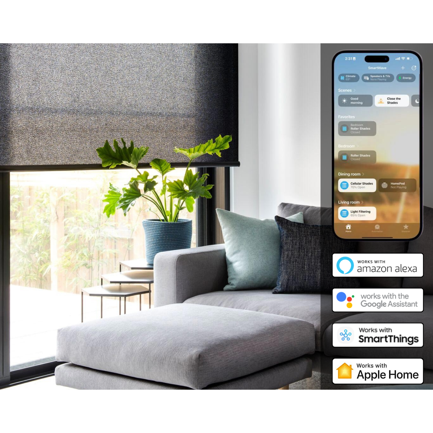 - Our electric shade motors integrate effortlessly with Amazon Alexa, Apple HomeKit, Samsung SmartThings, and Google Assistant.