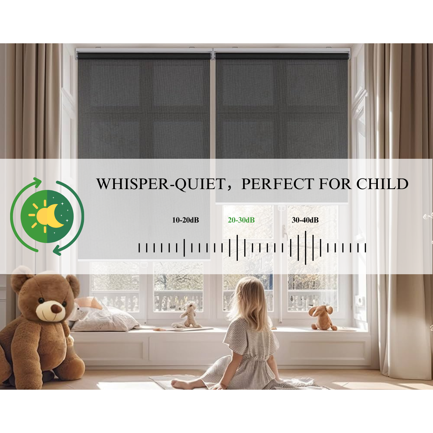 - Our electric roller shades are engineered to operate with minimal noise, customizable to your preference within a range of 20-30dB. The whisper-quiet function ensures that the operation won’t disturb your children, making it perfect for nurseries or quiet spaces.