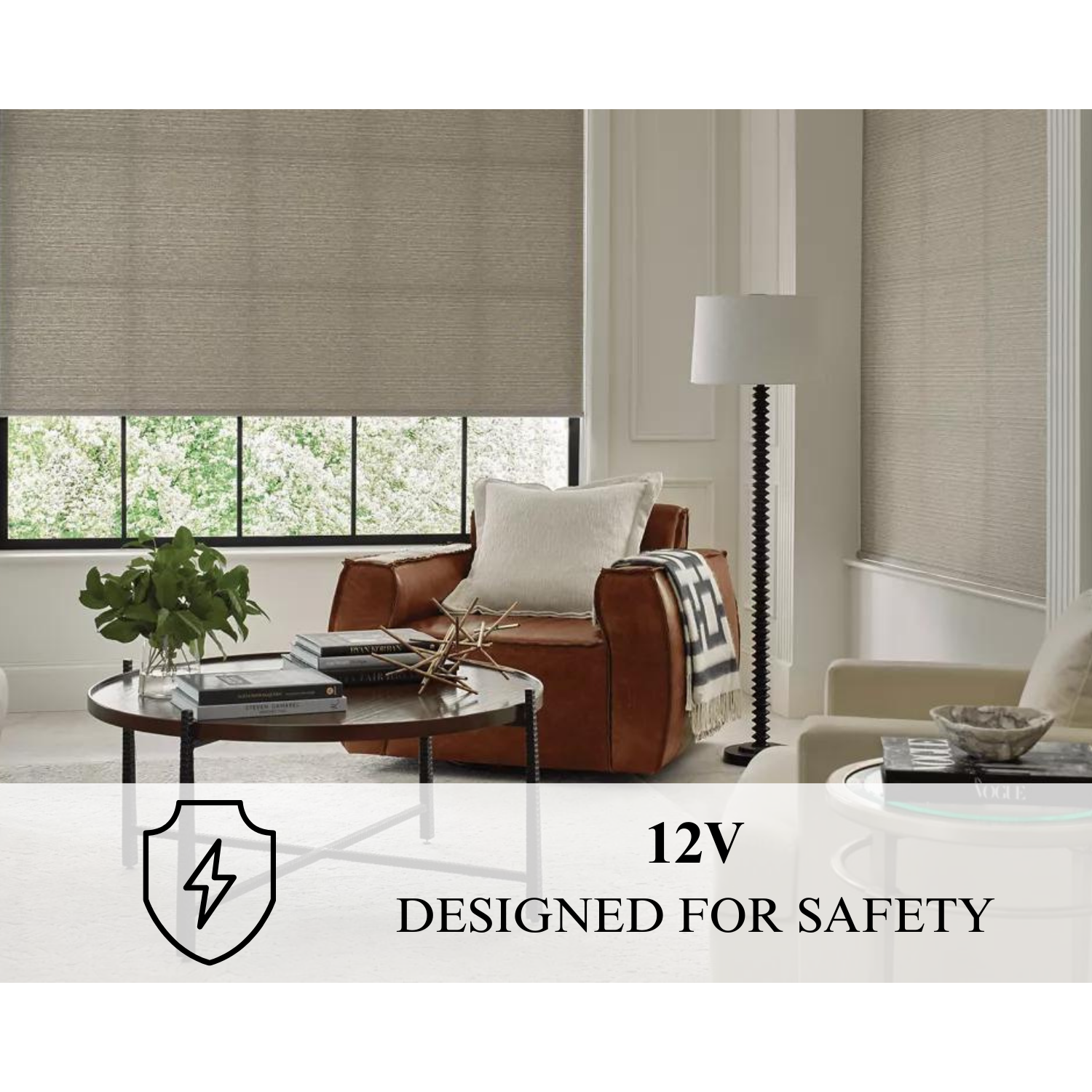 - Our electric roller shades are powered by a 12V low voltage system, providing a safer alternative to standard high-voltage options.